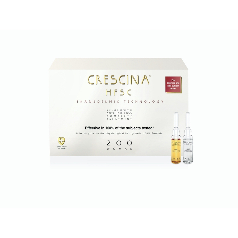 Crescina Transdermic juukseampullid juuste kasvu taastamiseks – 200 naistele. Crescina Transdermic Re-Growth HFSC on paikseks kasutamiseks mõeldud kosmeetikatoode, mis soodustab füsioloogiliselt juuste kasvamist ja aitab juukseid tihendada. Sisaldab patenteeritud segu toimeainetest Crescina Re-Growth (tsüstein, lüsiin, glükoprotein ja Stem-Engine (tüvirakkude stimulaator) on viidud spetsiaalsetesse kandeainetesse, mis võimaldavad nende järk-järgulist imendumist peanahka. Toote koostist on võimendatud Labo transdermaaise tehnoloogiaga ning seda on rikastatud 3 tugevdajaga, mis hõlbustavad toimeainete tungimist peanahka. Täielik tõhusus katseisikute puhul. 200 kontsentratsiooniga toode sobib kasutamiseks juuste hõrenemise algstaadiumis. Spetsiaalne koostis naistele. Šveitsi ja Euroopa patendid.