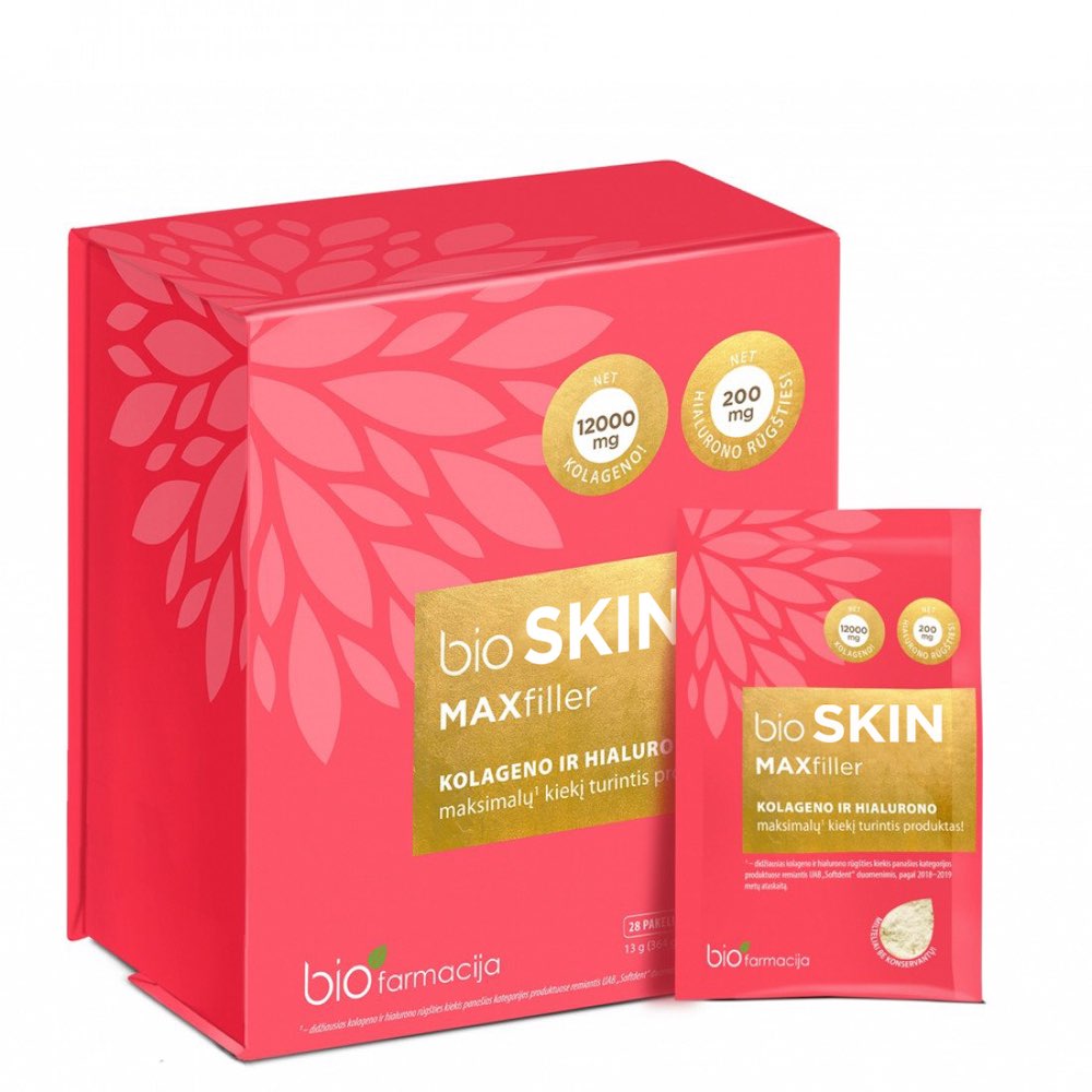 Kõrge kollageeni ja naatriumhüaluronaadi sisaldusega BIOFARMACIJA Skin Maxfiller toidulisand naha tervise toetuseks.