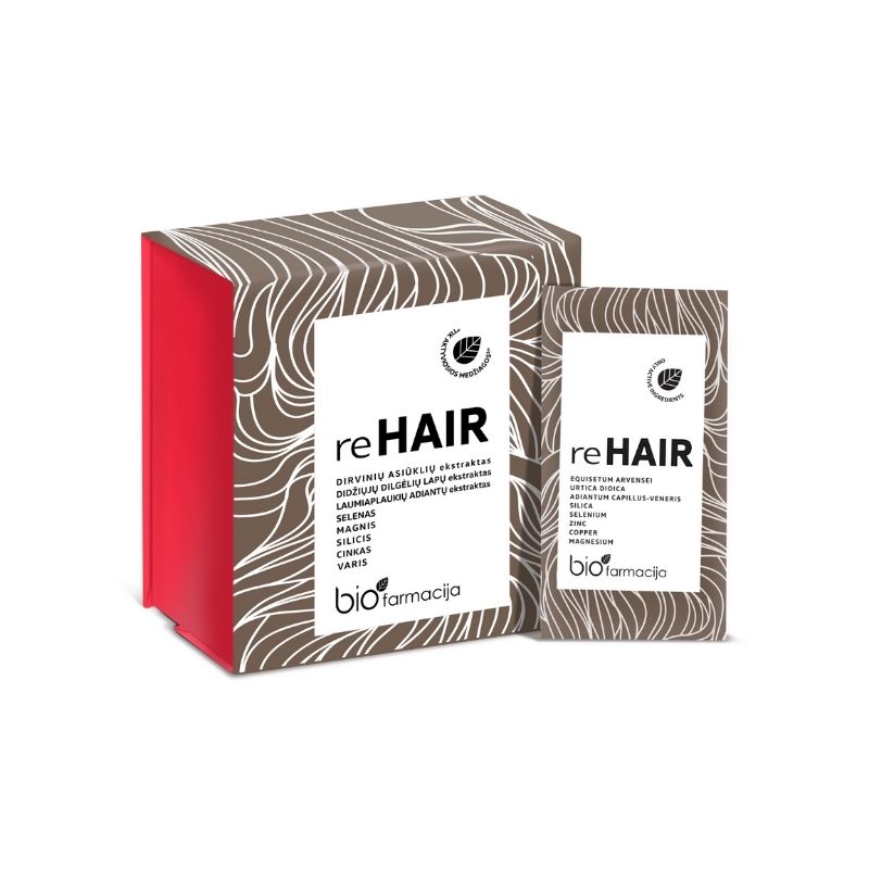 BIOFARMACIJA ReHair toidulisand juuste tervise toetuseks, tugevdab struktuuri, soodustab juuksekasvu ja aitab peatada juuste väljalangemist. Spetsiaalselt juuste tervise heaks väljatöötatud valem koosneb 5 mineraalainest ja 3 taimeekstraktist. Taimsed toimeained – põldosi, kõrvenõges ja juusadiantumi ekstraktid sisaldavad räni, tsinki, seleeni ja vaske ning aitavad säilitada juuste head seisundit. Vask aitab kaasa juuste normaalsele pigmentatsioonile. Tsink ja seleen aitavad hoida juukseid normaalsena. Taimsed ekstraktid toetavad juuste seisundi paranemist ja soodustavad nende kasvu. Juusadiantumi ekstrakt aitab peatada juuste väljalangemist. Sobib kasutamiseks meestele ja naistele. Karbis on 28 pakki.